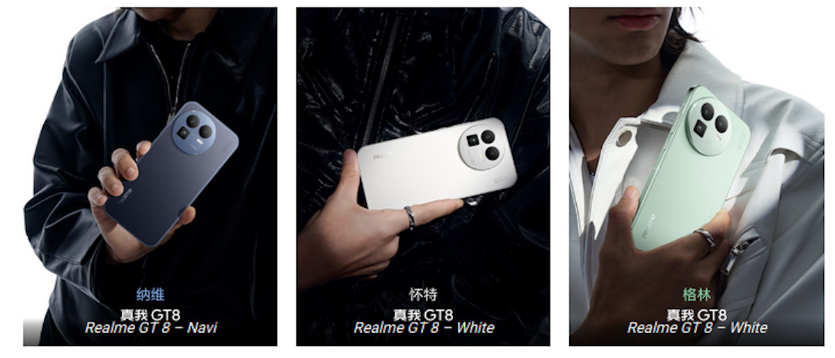 Dalam rilis resmi yang dibagikan pada Senin (20/10), Realme memamerkan desain Realme GT 8 untuk pertama kalinya. Ponsel ini akan hadir dalam tiga varian warna, yakni Navi, White, dan Green, masing-masing menawarkan karakter dan material berbeda.