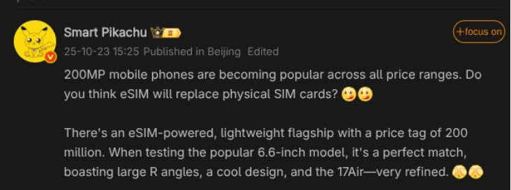 Menariknya, laporan itu juga menyebutkan bahwa Xiaomi 17 Air akan hadir tanpa slot kartu SIM fisik, sepenuhnya mengandalkan teknologi eSIM. Langkah ini sejalan dengan upaya Xiaomi untuk memangkas ruang internal dan menjaga ketipisan bodi perangkat.